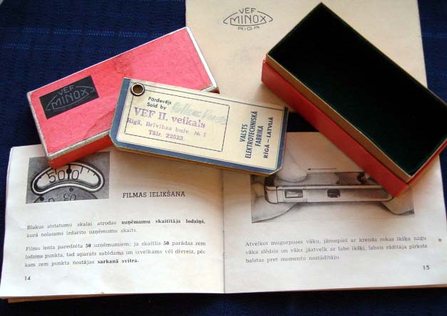 I will be honest that I don't know what to make of this set. I bought it recently from an eBay seller in Riga Latvia who sells an awful lot of Riga Minox items. The set was represented as being original but the camera is so clean it is hard to believe it was ever used let alone 60+ years old. It was sold as a camera with its box and original warranty "passport" along with an instruction manual (in Latvian) and a negative holding folder. Here are some photos of the set: